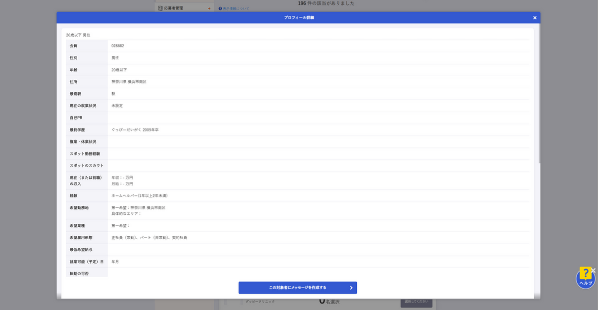 スカウト対象者の一覧ページで「詳細」というボタンを押していただくと、その求職者のプロフィールを確認いただくことができます。