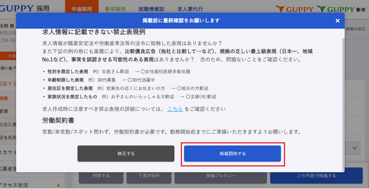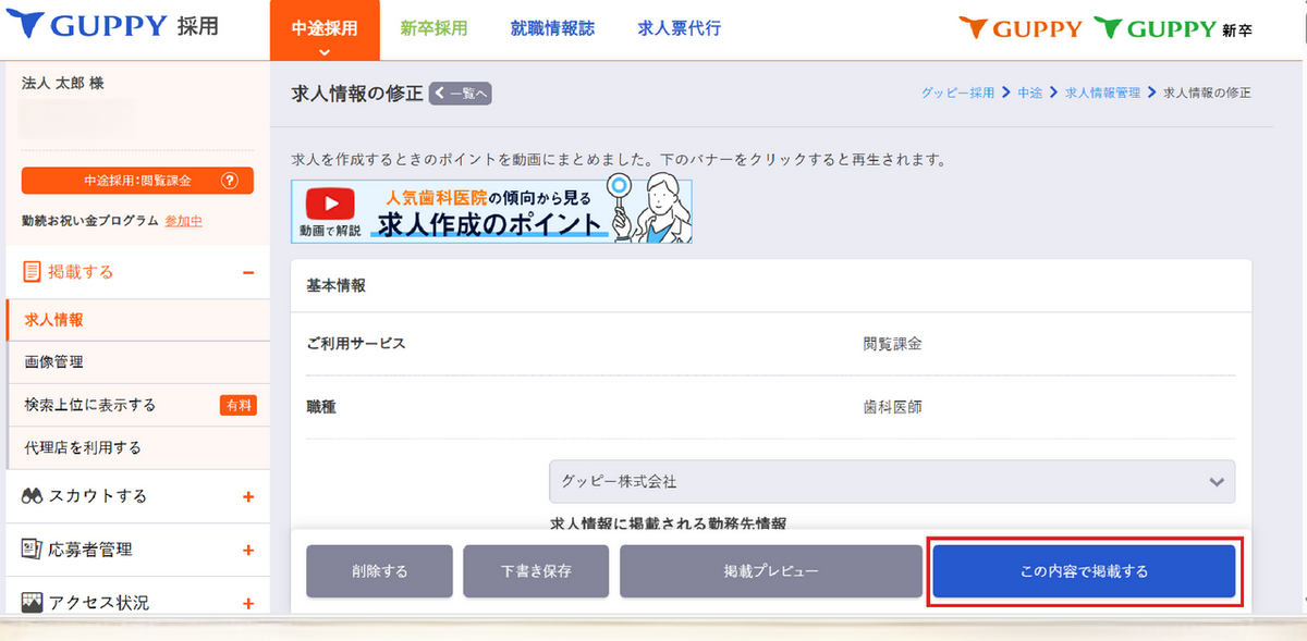 画面右下「この内容で掲載を開始する」をクリック、次の画面で「掲載開始する」をクリックすると即時掲載可能。(ポイントがない場合は一度下書き保存をし、ポイント購入に進んでください)