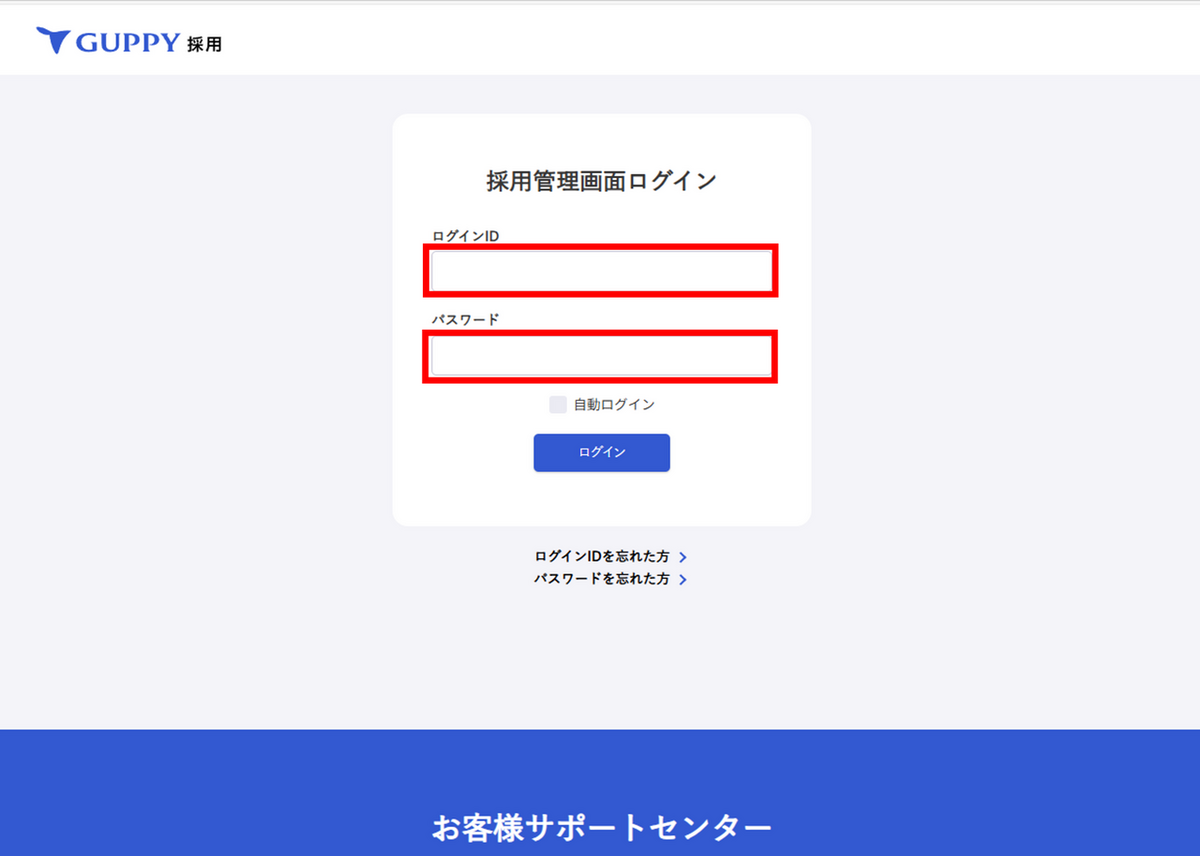 ご登録完了メールが登録アドレス宛に届きましたら、メールに記載のログインIDと初期パスワードで【GUPPY採用管理画面】にログインします。